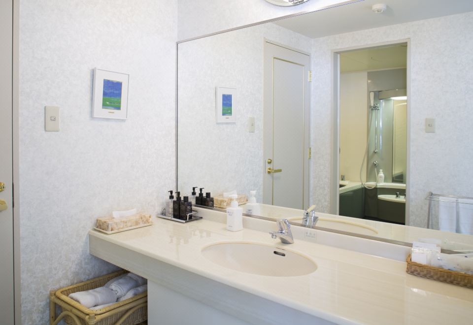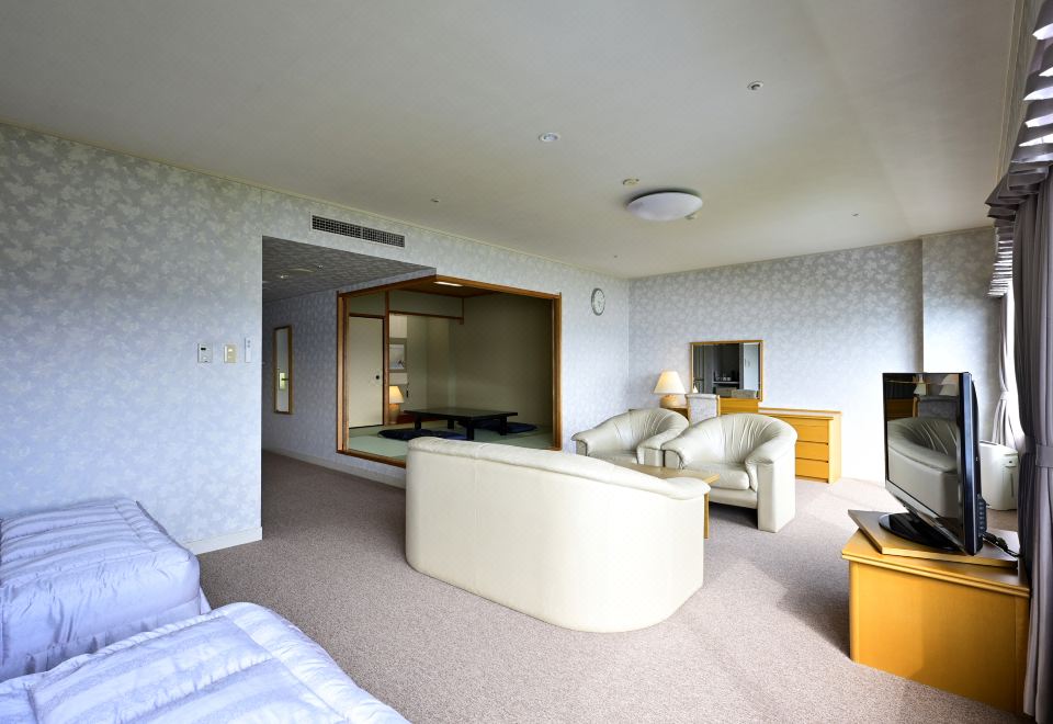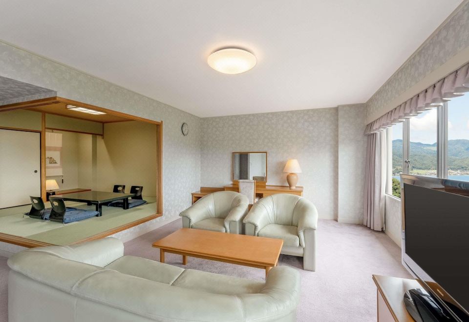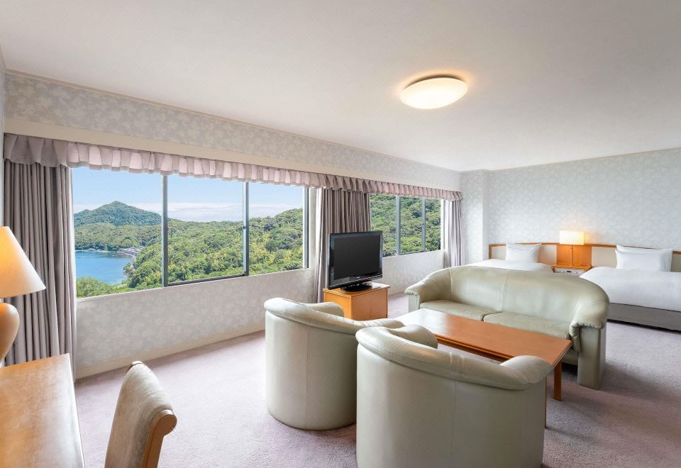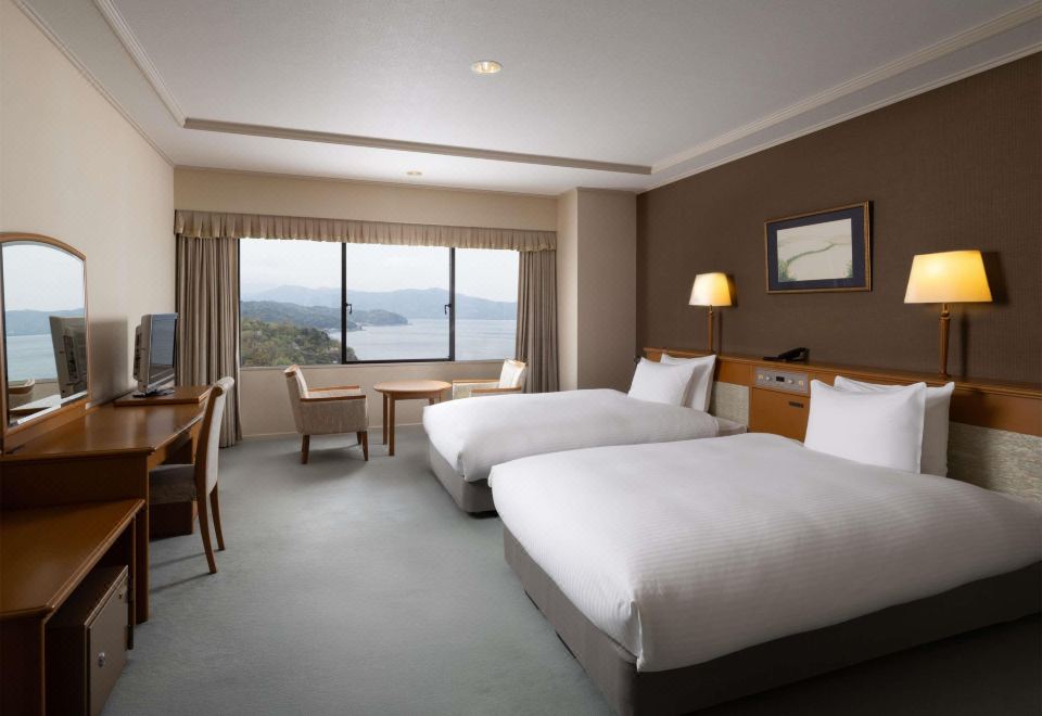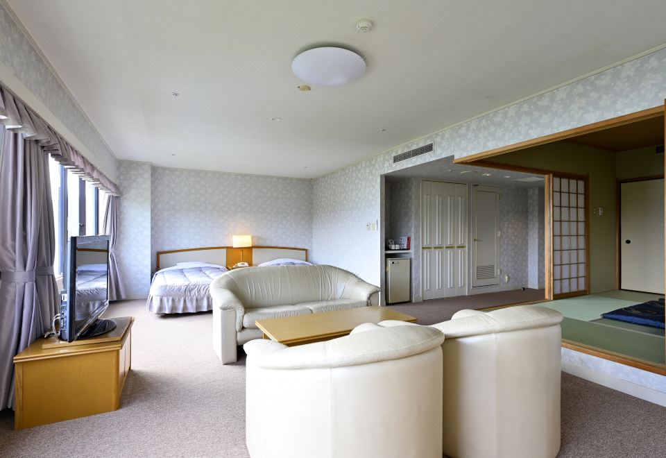 经典普通套房,日式和西式风格,配备 2 张单人床和 4 张蒲团垫床,可欣赏海景