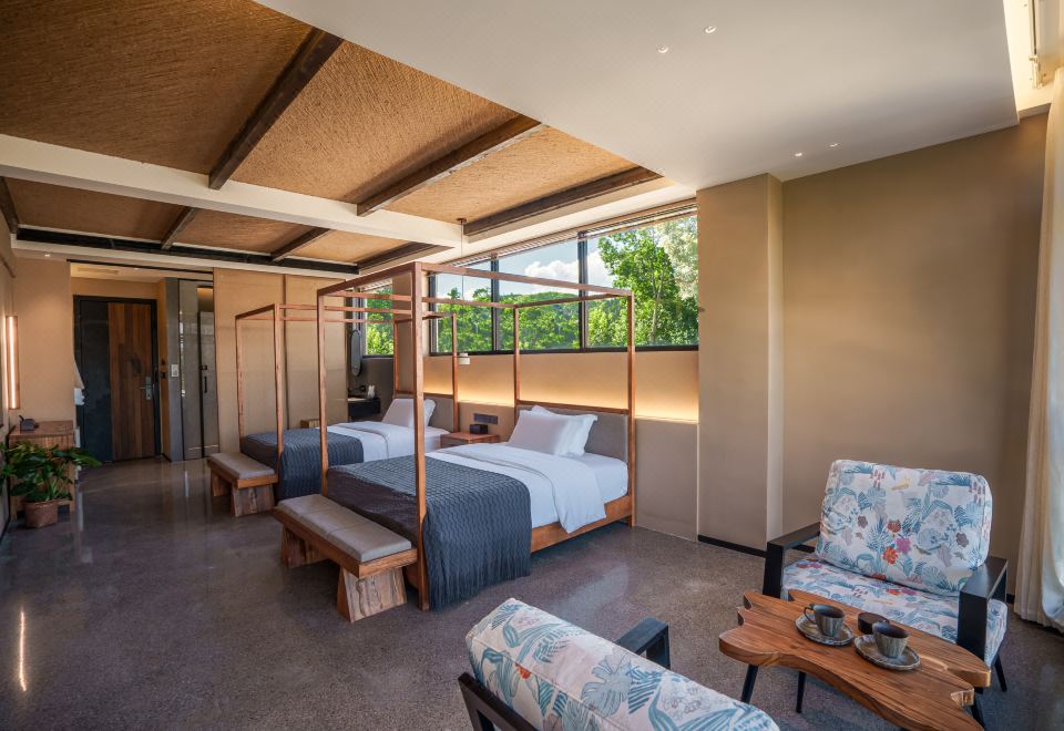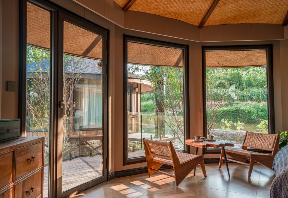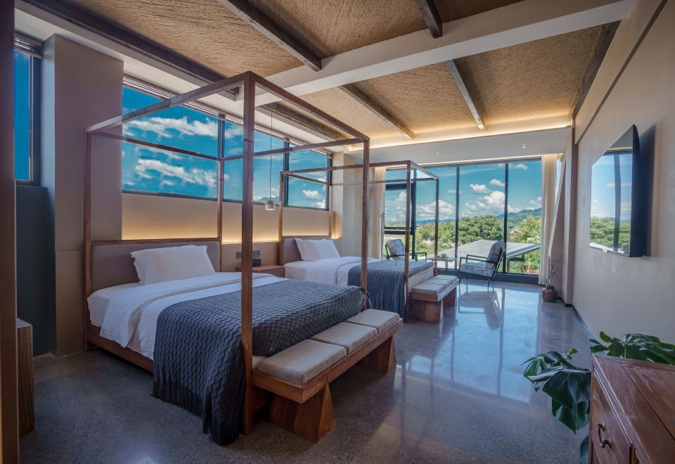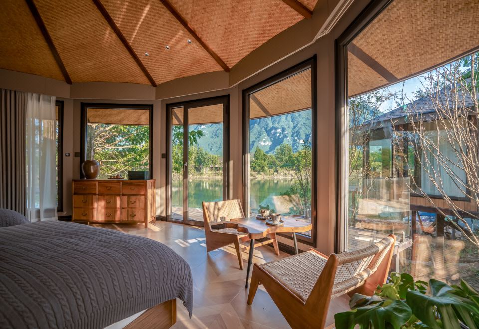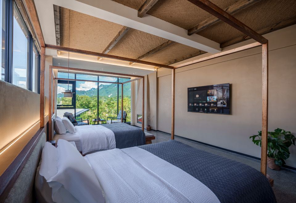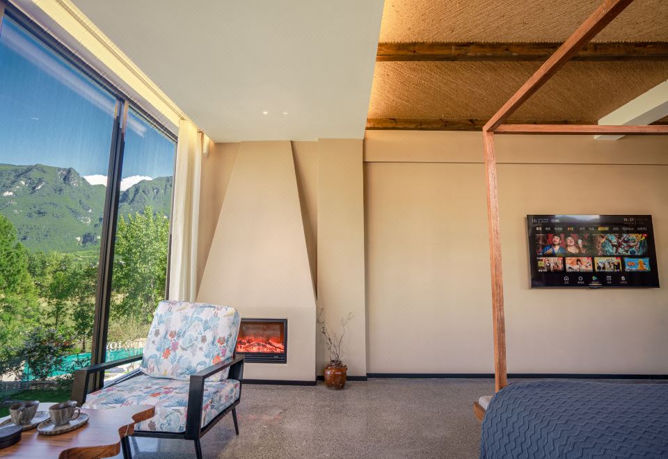 全屋地暖·青岚与荷 | 180°山河景闺蜜双床房|取暖壁炉