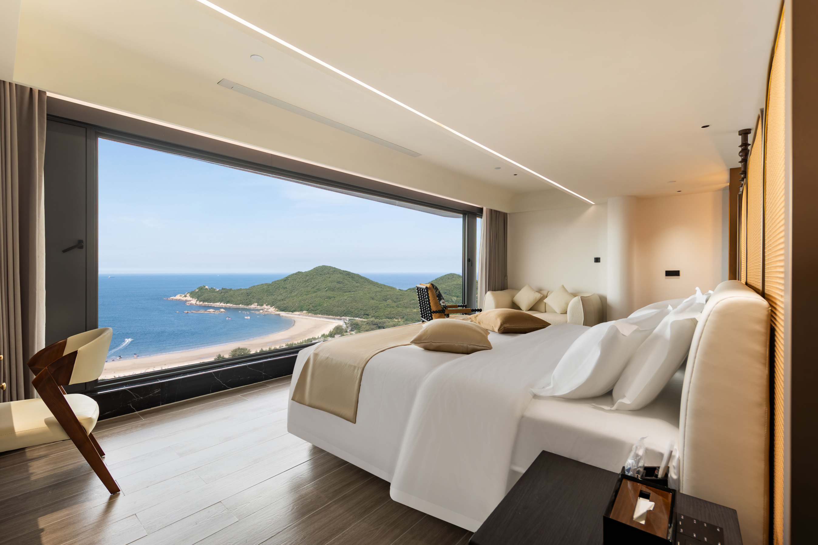 坐拥青澳湾的无界画幅,酒店占据得天独厚的地理座标,正对着名的青澳湾沙滩与北回归线广场。这意味着,您无需远行,便可实现踏浪的度假理想。下楼步行仅需几分钟,便能拥抱细软的沙滩与澄澈的海水。而更独特的体验在于,酒店巧妙地将自身置于30层的高度,让每一位住客得以摆脱地面喧嚣,以一线海景的上帝视角,俯瞰青澳湾的蔚蓝弧线与壮丽日出,将潮起潮落与云卷云舒尽收眼底,坐享一片私密的“顶楼绝色风光”。