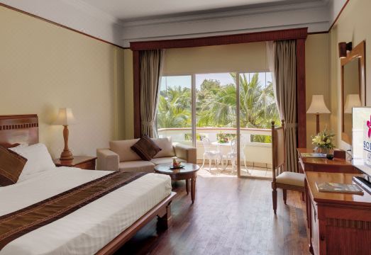 傳統的高棉酒店-速卡海灘度假村是一家海濱度假酒店,位于柬埔寨王國西哈努克省。速卡海灘是一個非常受國際和當地歡迎的旅游勝地,因為它擁有原始的1.5公里長的白沙灘。速卡海灘度假村結合了傳統高棉和現代的建筑設計。此外,度假村還設有美麗的園景花園,游泳池,餐廳,酒吧以及水療設施。所有客房寬敞舒適均設有私人陽臺,空調,平面電視,無線網絡和熱水淋浴。其它設施包括室內保險箱,迷你吧,浴袍和洗浴用品等。除此之外,其它設備包括速卡維加斯賭場,24小時客房餐飲服務,洗衣服務,提款機,機場接送,紀念品商店,商務中心和迷你圖書館以及休閑娛樂部。在康樂方面還包括免費蒸汽浴室,桑拿浴室,健身中心,甚至小童俱樂部。占巴咖啡廳位于度假村大堂,也提供各式各樣的菜肴不等。