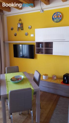 这家空调度假屋配有1间卧室、起居室、带冰箱和咖啡机的设施齐全的厨房以及1间带坐浴盆和淋浴设施的浴室。这家度假屋还提供休息区、洗衣机以及1间带免费洗浴用品的浴室。