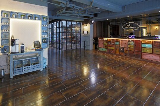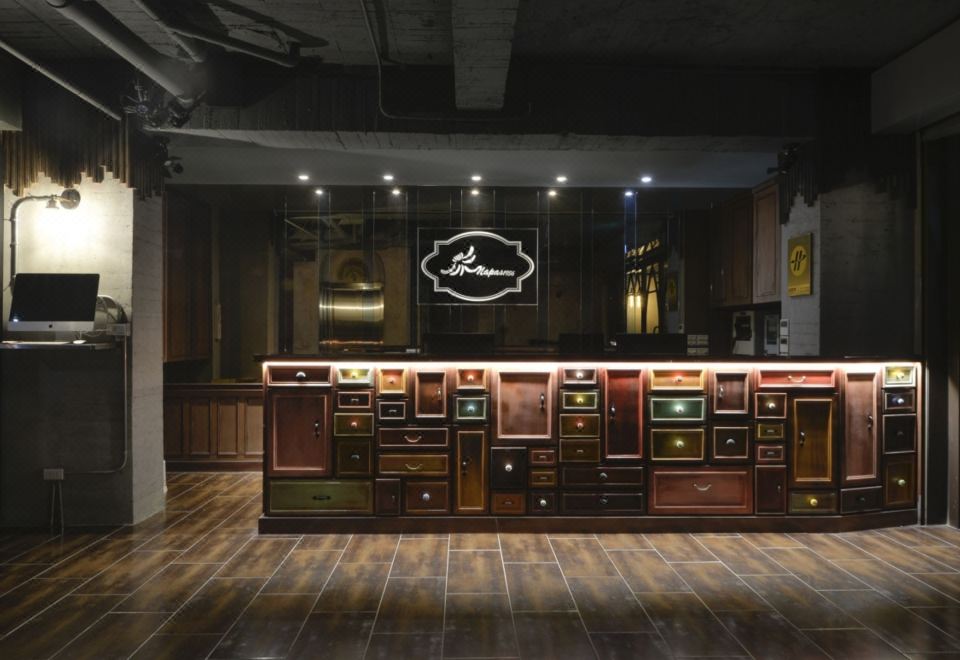 一旁的玻璃門可供旅客創作留言.天井總共嵌入了四十種不同款式的窗花;當燈光穿透天井,窗花的倒影反射于走廊上,隨著日出日落,旅客能感受到不同的光影變化;從天井一樓抬頭望去,可看到五朵盛開且耀眼的花,期盼旅人們都能感受到極佳的待遇;墻上靜止的時鐘,希望時光能永遠停在這美好的時刻。